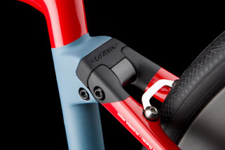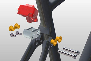 「Cento1NDR」のために開発されたウィリエールオリジナルの振動吸収機構「ACTIFLEX(アクティフレックス)」は、シートチューブとシートステーの接合部にエラストマー(弾性素材)を挿入することで、リアトライアングルが数ミリ単位でしなるように設計されています。